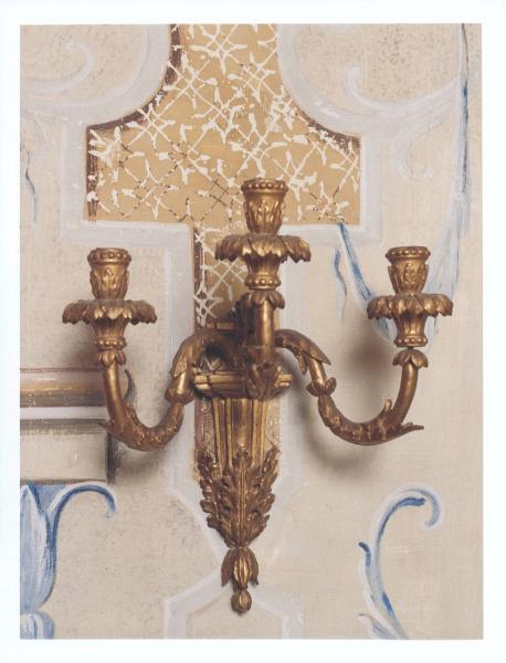 Lampada a muro a tre bracci a guisa di tralcio vegetale terminante a motivo di foglie estroflesse sormonate da reggicero con bordo perlinato e decorato con foglie; fusto scanalato di linea rastremata terminante a mazzo di foglie con finale inferiore a bocciolo