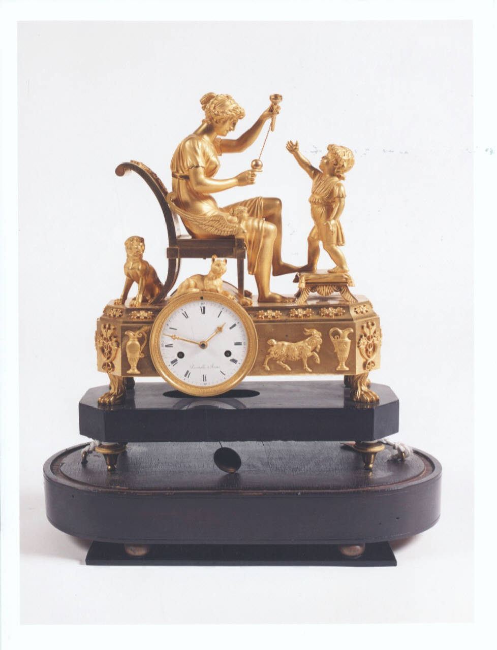 - NOTIZIE STORICO CRITICHE Tipico esemplare di pendola direttorio come testimonia il soggetto: una scena d'interno dell'epoca con personaggi della mitologia classica (Venere ed Eros). In numerose pendole di questo periodo sono infatti raffigurati arredi dell'epoca che fanno da sfondo a scene mitologiche e allegoriche. Da segnalare una pendola con la stessa iconografia, con l'unica variante del marmo nero al posto del basamento in bronzo dorato, esposta in occasione della Biennale Antiquaria "Tesori del tempo" tenutasi a Verona nel 1996. Secondo l'inventario allegato all'atto notarile, l'oggetto proviene dalla Galleria Subert di Milano