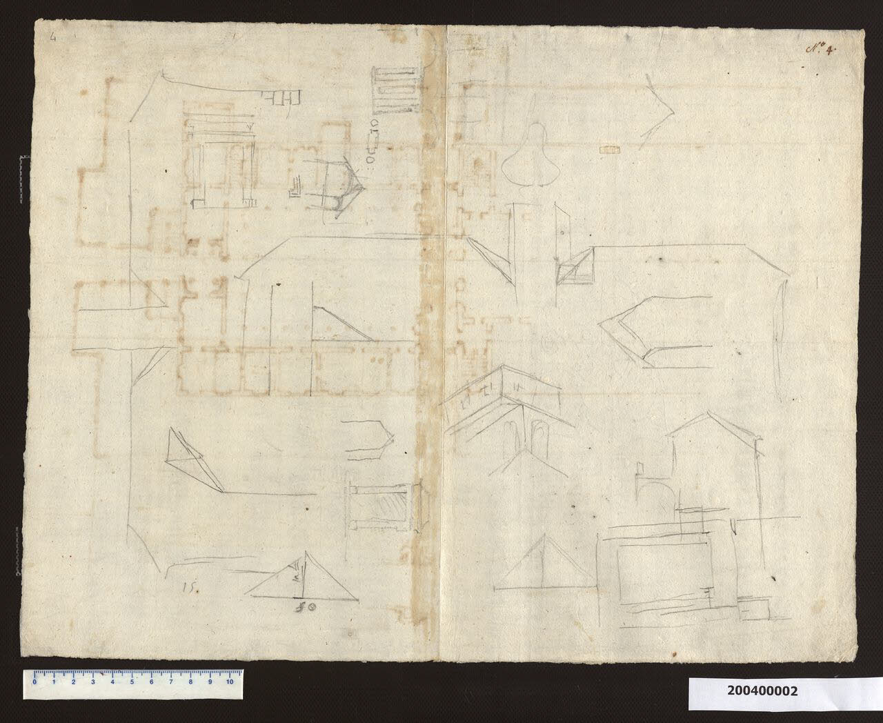 - NOTIZIE STORICO CRITICHE Tra gli schizzi realizzati sul verso del disegno di progetto, si possono individuare due studi per le finestre del castello, due studi per i profili del tetto forse nel punto di innesto del corpo della torre, uno schizzo di porticato con colonne e tamponamento centrale.\nGli altri schizzi e sezioni sono di difficile interpretazione e individuazione.