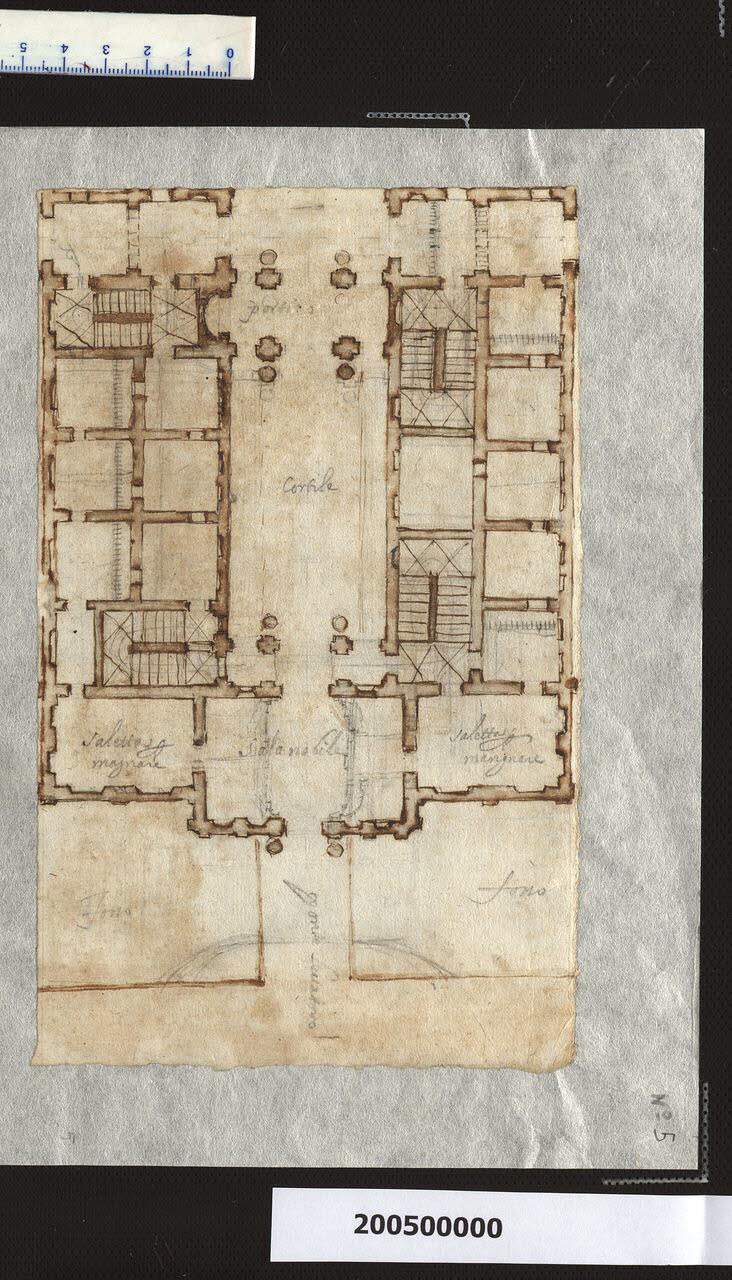 - NOTIZIE STORICO CRITICHE Nella "Spiegazione de numeri" del tomo nel quale era rilegato il disegno (su un unico supporto di legatura con il disegno inv. 2,5 bis) viene definito: "Due altri detti sopra alcune parti dello stesso (...)".\nIl disegno è attribuibile a Martinelli e riporta una soluzione alternativa per la parte del castello a est dell'asse nord-sud, che nel disegno complessivo (Milano, Collezione Sardini Martinelli inv. 2,4 r) risultava abbozzata a matita.\nIn questo caso scompaiono i due corpi scala sulla facciata est e all'ingresso compare un portale con due colonne libere simile ai due previsti nelle facciate nord e sud; il "salotto" diventa una "sala nobile", collegata ai due grandi ambienti laterali adibiti a "sala per mangiare". Il cortiletto si allunga, in quanto la grande sala centrale a questo punto scompare ed è delimitato sui lati corti da una coppia di piastroni a croce con colonne libere affiancate; questi due elementi sono ripetuti oltre il cortiletto a formare il portico, che ha la sola funzione di "filtro" trasparente verso l'attraversamento sull'asse nord-sud e quindi verso il cortile più grande che però non è qui rappresentato.\nQuattro scaloni sono inseriti agli angoli del cortiletto: i due a sud sono disposti ortogonalmente rispetto a quelli a nord. In tutti è indicato con un segno a matita il verso di salita.\nLe stanze riportano delle "tacche" a matita che presumibilmente servirono a Martinelli per definirne le proporzioni o la misura approssimativa.