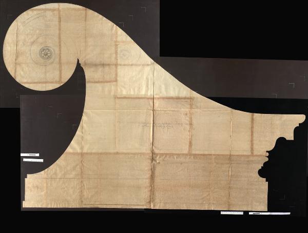 disegno eseguito con grafite, principalmente a riga e compasso con tratti a mano libera; è tracciato su foglio sagomato di carta chiara imbrunita. Il supporto è composto da sedici fogli incollati