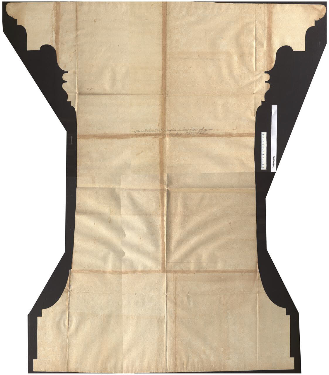 disegno eseguito con grafite, a mano libera; è tracciato su foglio sagomato di carta chiara imbrunita. Il supporto è composto da otto fogli incollati