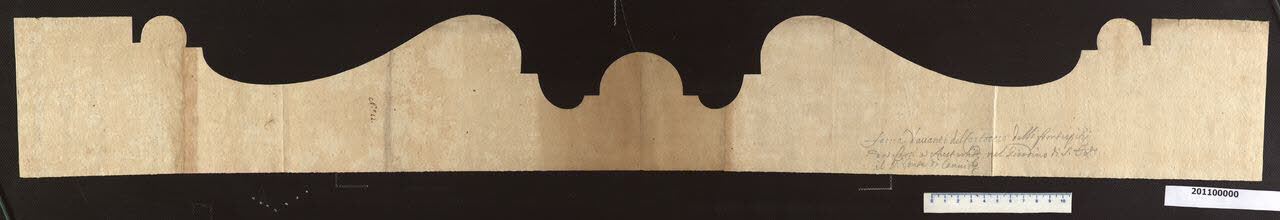- NOTIZIE STORICO CRITICHE Nella "Spiegazione de numeri" del tomo nel quale era rilegato il disegno viene definito: "Veduta di Faccia dei Frontespizj".\nIl disegno fa parte di un gruppo di tre modani che si riferiscono al frontespizio dell'ingresso al giardino. Il portale d'ingresso, secondo Lorenz, è quello rilevabile dalla planimetria di Petruzzi databile verso il 1732, collocato nel lato sud-ovest del castello (Lorenz, 1991, MZ 336, p. 322) e si ipotizza che gli elementi rappresentati servissero per costruire la parte superiore dello stesso.\nlI disegno rappresenta la sagoma frontale della voluta del frontespizio.\nL'elemento rappresentato in questo disegno, si trova oggi in due esemplari isolati nel giardino, usati come sostegno per le statue allegoriche di Giuliani.