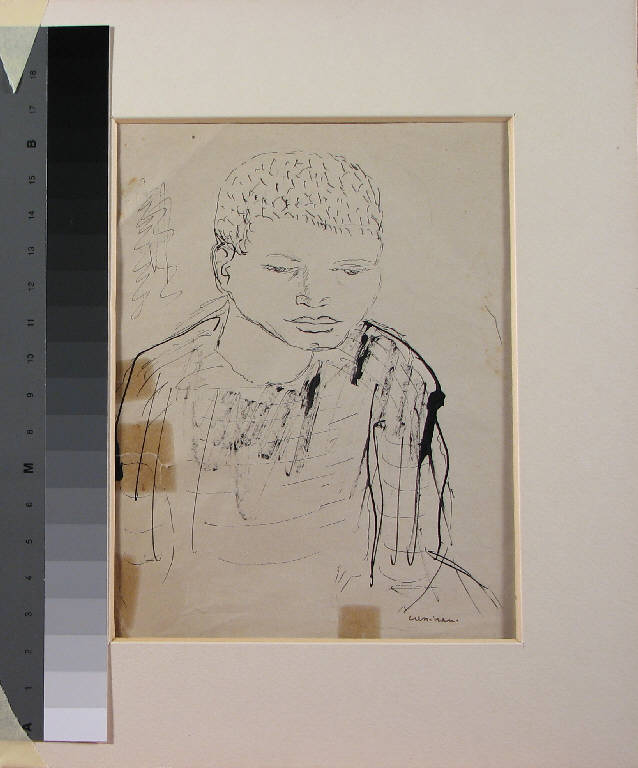 - NOTIZIE STORICO CRITICHE Il disegno potrebbe essere un ritratto del figlio dell'artista, altre volte rappresentato nelle opere di Cassinari.\nAnche Lajolo, nel racconto della sua visita allo studio dell'amico, parla di una tela alla parete in cui il volto del "primo figlio bambino si incrocia con gli occhi del pittore, un amore fatto di fiato, l'incontro di due fiori quando l'aria li fa combaciare l'uno con l'altro." (Lajolo 1984).\nIl disegno, dal tratto sottile e incentrato più sull'introspezione psicologica del personaggio ritratto che sulla costruzione plastica e geometrizzante delle forme, potrebbe essere datato all'ultima fase d'attività di Cassinari, avente inizio negli anni '60.