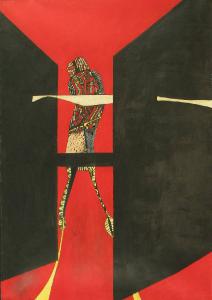 figura antropomorfa dal profilo allungato, costruita al suo interno da piccoli elementi decorativi; sembra attraversare un varco rosso tra due pareti nere; colore steso in maniera omogenea