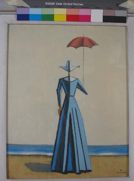 in posizione centrale è raffigurata una suora vista di spalle; indossa una veste azzurra, un cappello bianco e regge un ombrello rosso dal manico lungo e sottile; ambientazione sulla riva di una spiaggia; la suora è rivolta verso il mare; la linea dell'orizzonte è posta in basso, verso i piedi della figura