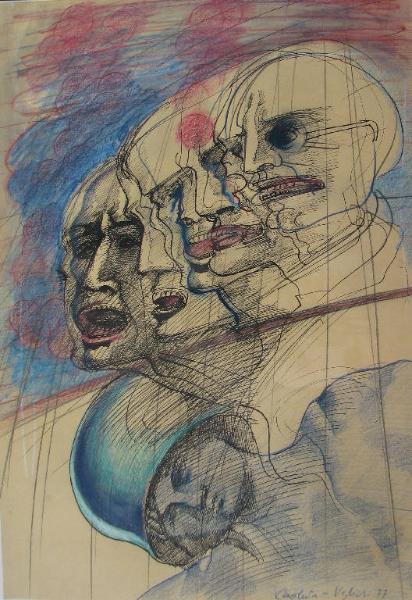 in alto, cinque teste di profilo di personaggi con le bocche aperte in grida o lamenti; in basso, una sesta figura, sdraiata con gli occhi chiusi, apparentemente priva di vita, con elemetto e busto colorati di blu