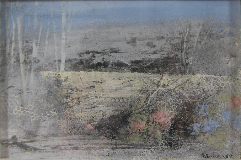 - NOTIZIE STORICO CRITICHE Il dipinto ritrae un paesaggio di confine, in cui si sovrappongono natura e tracce umane (la rete metallica).\nIl tema è tra quelli affrontati dall'artista fin dai suoi esordi nell'ambito del Realismo Esistenziale, anche se la data riconduce quest'opera ad una fase piuttosto lontana da allora.\nAlla fine degli anni '60 infatti l'artista ha già dato avvio ad una ricerca incentrata sempre sul paesaggio, ma, nello specifico, sul rapporto tra interno ed esterno, indagato di volta in volta attraverso i motivi della finestra, dello specchio, del quadro nel quadro. \nProbabilmente è in questo periodo che va ambientato il racconto di Davide Lajolo su una sua visita allo studio milanese di Banchieri: Lajolo vi assiste all'elaborazione di un autoritratto in cui il pittore si rappresenta nell'atto di dipingere un quadro.\nLo scrittore racconta di aver poi ricevuto quel dipinto in regalo: "A distanza di anni, quando guardo quella tela ho l'impressione di sentire ancora Banchieri trattenere il fiato mentre è intento a dipingerla" (Lajolo D. 1984). \nIl dipinto descritto non è entrato a far parte della collezione conservata dalla seconda moglie Angela Candiani a Milano.