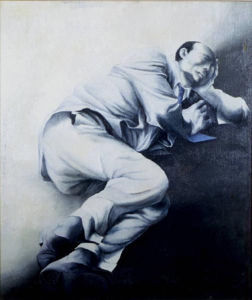 uomo che riposa sdraiato su un fianco, con la testa appoggiata sul braccio; indossa scarpe, giacca e cravatta; il corpo della figura occupa diagonalmente lo spazio; sfondo grigio; nei toni del grigio anche la figura; la cravatta azzurra è l'unica nota squillante