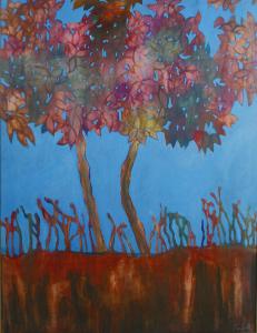 sullo sfondo di un cielo azzurro intenso si stagliano le forme di due alberi su un terreno; alberi, foglie, terreno e fili d'erba sono tutti dipinti, in contrasto con l'omogeneità dello sfondo, nelle stesse variazioni di colore, che trapassano dal verde spento al rosso, al rosa