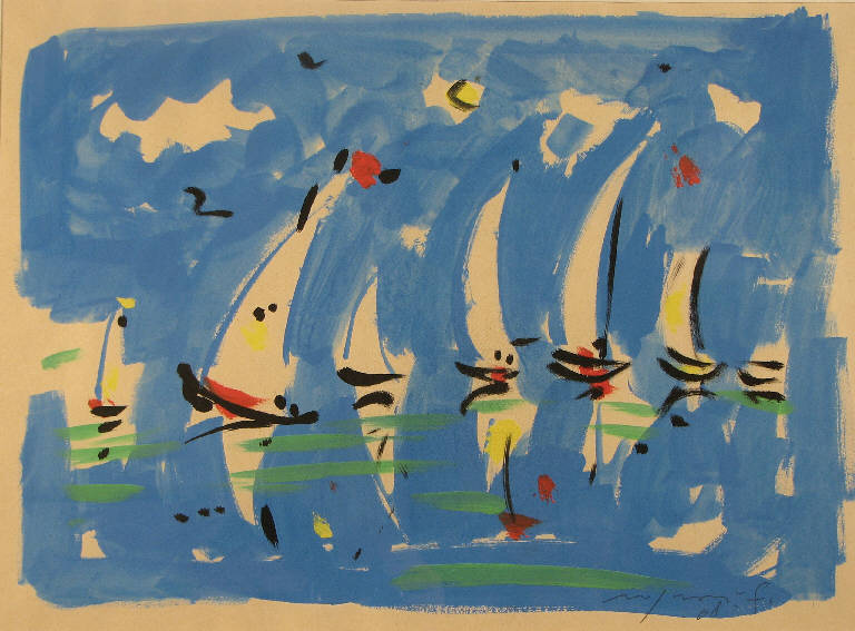 - NOTIZIE STORICO CRITICHE Il dipinto potrebbe anche ritrarre, invece che un paesaggio marino, delle barche a vela sulle acque del lago di Luino, dove Rognoni trascorreva molto tempo.\nL'opera si adatta bene a illustrare quanto Davide Lajolo rileva in una sua visita allo studio dell'artista: "Nello studio milanese di Franco Rognoni c'è un'aria di festa. Festa di colori, di figure, di cieli aperti.". Lajolo dice a Rognoni: "Non osi dire la parola: poesia. Eppure si sente che tu hai una visione lirica della vita e delle cose." (Lajolo 1976).