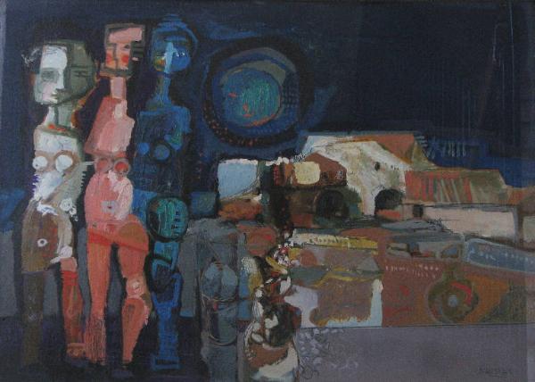 - NOTIZIE STORICO CRITICHE Il dipinto presenta caratteristiche stilistiche e tematiche omogenee con quelle delle opere presentate da D'Andrea in una mostra del 1972 alla Galleria Nuovo Sagittario di Milano, pubblicate in catalogo con una introduzione di Enzo Fabiani (D'Andrea 1972).\nA quei tempi D'Andrea è impegnato in una ricerca figurativa di tipo espressionista-informale: in una pittura dai colori vivaci, densa e materica, si ammassano uno sull'altro personaggi simili a statue-stele, in cui la lezione di Picasso si mescola, secondo Fabiani, con influssi di certa arte medievale propria della Lucchesia, terra d'origine del pittore, e delle antiche steli della Lunigiana. \nTra le opere riprodotte nel catalogo, una in particolare risulta molto vicina a questa della collezione Lajolo: "Donna rossa", in cui compare la stessa composizione con il gruppo di figure sulla sinistra e la veduta di paese sulla destra (D'Andrea 1972, pag. 9).\nA fine decennio, a partire dal 1977, l'artista intraprenderà una strada che lo porterà ad esiti molto differenti (Lorenzo D'Andrea 1984, v. NSK 211), motivo per cui si può affermare con una certa sicurezza che il dipinto, non datato, sia stato eseguito entro la prima metà degli anni '70.