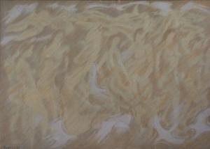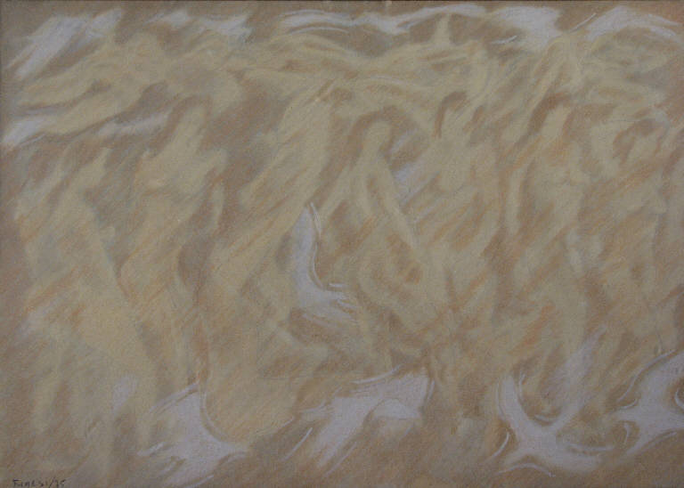 gruppo di nudi femminili allineati in piedi lungo l'intera superficie disegnata; al di sopra di questa fila di fgure compaiono altri nudi, sdraiati; i corpi femminili si mescolano all'immagine di bianchi gabbiani con le ali spiegate in volo; le figure si intravedono, quasi tono su tono, su uno sfono giallo-ocra che sembra ambientare la scena in un campo di grano