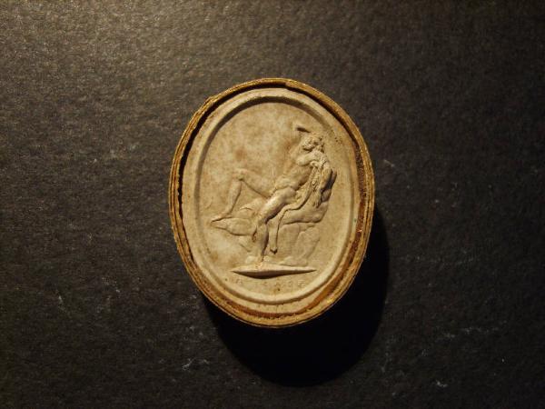 Calco circondato da una fascetta in carta bordata d'oro; le misure del calco e della fascetta insieme sono cm 2.9x2.4.