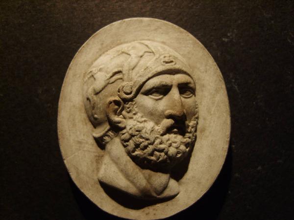 Volto d'uomo con elmo decorato con figure di cervi