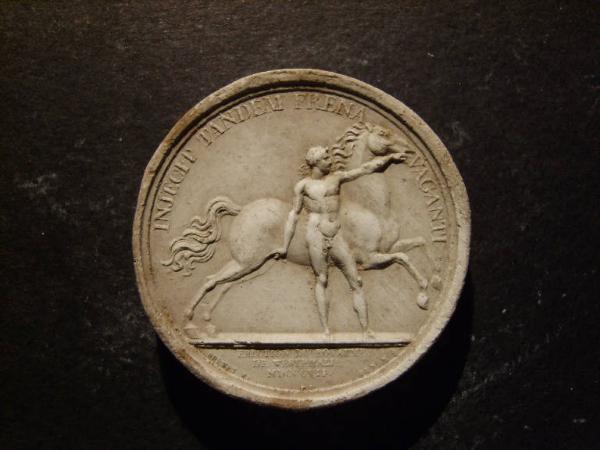 - NOTIZIE STORICO CRITICHE Medaglia celebrativa di un articolo del trattato di Tilsit secondo il quale l'elettorato di Hannover veniva trasformato in regno affidandolo a Jerome, fratello minore di Napoleone. La medaglia raffigura un eroe che ferma un cavallo in corsa, allusione ad Hannover la cui zecca e la cui armeria avevano come simbolo un cavallo in corsa.