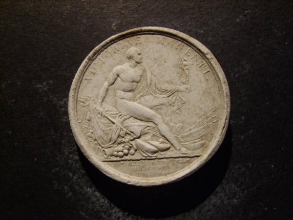 Medaglia commemorativa della battaglia contro la Prussia. Allegoria della Vittoria militare con soldato seduto sulle armi e con in mano una Vittoria alata