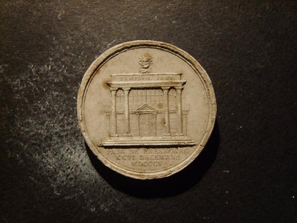 Medaglia allegorica della rottura del Trattato di Presburgo. Tempio di Giano a Presburgo con le porte chiuse