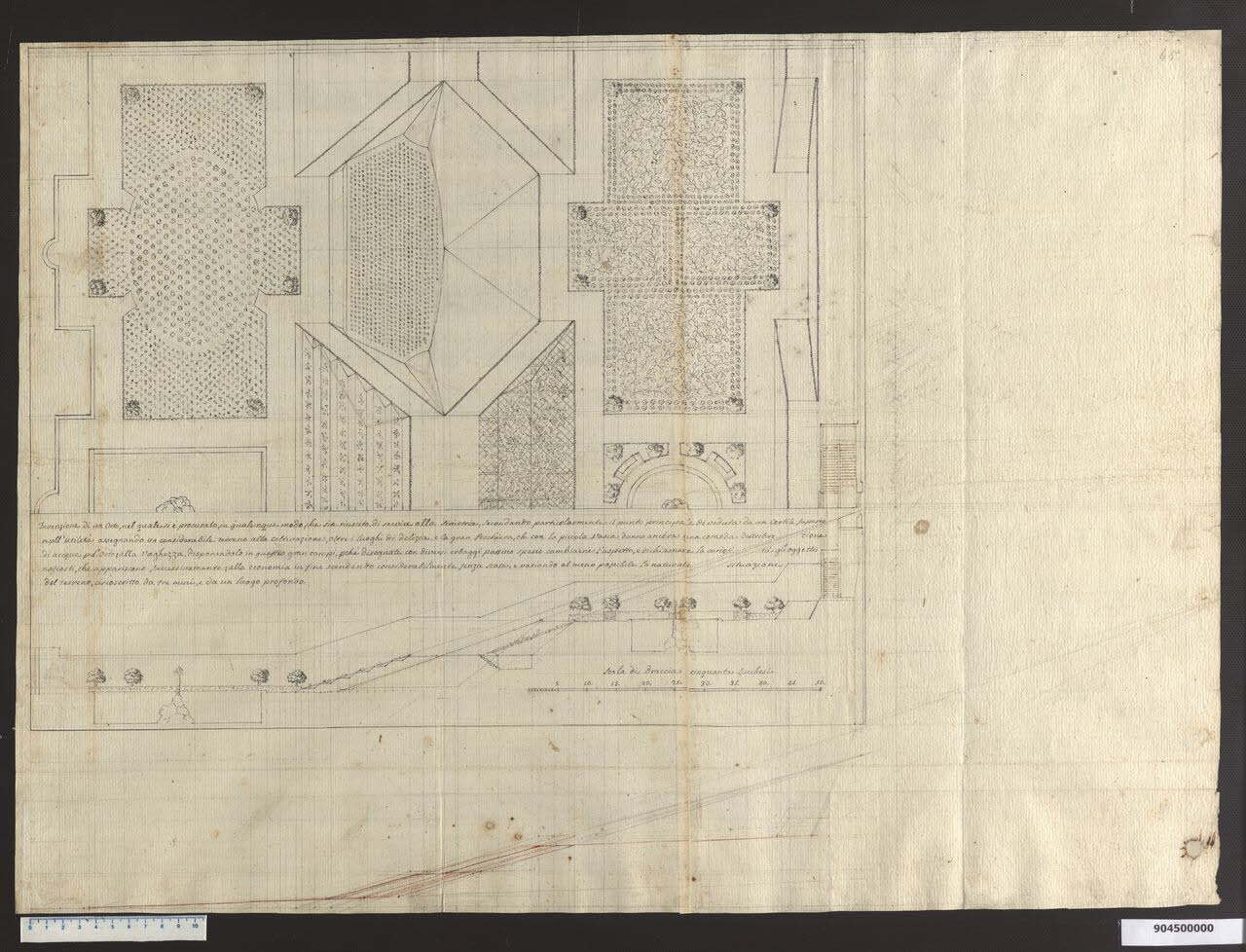 - NOTIZIE STORICO CRITICHE Il disegno si riferisce ad una porzione del giardino principale, che potrebbe essere definito "jardin potager". Lo stesso Sardini, che indica questo settore come "orto", pensa di destinare buona parte del terreno alla coltivazione, sfruttando per l'irrigazione l'acqua delle vicine vasche, e piantando "diversi erbaggi" perché "possino cambiare l'aspetto e richiamare la curiosità gli oggetti nascosti che appariscono successivamente". La lunga didascalia di corredo ci informa inoltre delle modalità di accesso ai diversi livelli del terreno, ai quali si giunge "senza scale e variando al meno possibile la naturale situazione del terreno". Tutto ciò è poi reso graficamente nella sezione sottostante la pianta.