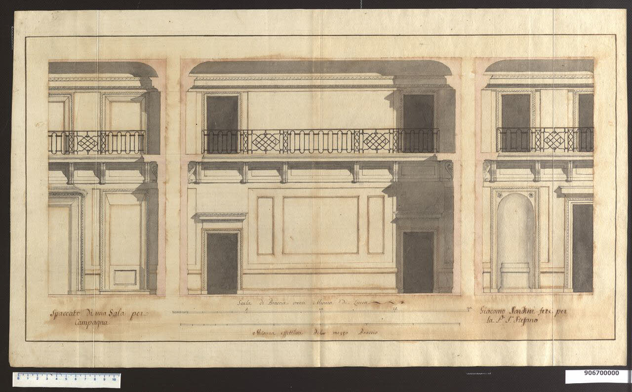 - NOTIZIE STORICO CRITICHE Dopo una lunga serie di contatti con Carlo Bianconi, interpellato per mettere a punto le idee per la villa a Pieve Santo Stefano del marchese Giacomo Sardini, quest'ultimo, dilettante di architettura, giunse a definire l'assetto decorativo della sala principale, tracciandone il disegno di presentazione che è l'elaborazione di precedenti grafici (Milano, Collezione Sardini Martinelli inv. 9,90 e 9,81). La sala a doppio volume, circondata da ringhiera, è orgogliosamente descritta dal committente come propria creazione: "a questa sala corre intorno sul livello del secondo piano un poggiuolo a ringhiera di ferro compartita secondo l'ordine generale di riquadri e sostenuta da modiglioni (...) questa sala che insieme col salotto annesso fu da me interamente disegnata e diretta nella architettura ha per cornicione la cornice architravata che ricorre dentro il portico del Panteon, e le porte degli appartamenti sono come quelle del tempietto della Sibilla tiburtina tutto nelle precise misure ed alcune invenzioni di ringhiera tanto ivi che nelle scale, ed altre particolarità mi dettero di che studiare per produrre qualche cosa di utile con aria di novità" (Archivio di Stato di Lucca, Archivio Sardini =AS, n. 128, Memorie ... M. Teresa Sardini, c. 18). Sulle pareti non appare traccia di ornato se non quello squisitamente architettonico che profila cornici e cornicione; i suggerimenti di Bianconi, che puntavano sull'inserimento di decorazioni figurative pittoriche o a bassorilievo (Milano, 9,96 e 9,84), sono stati circoscritti. Dalla descrizione della sala riportata nelle Memorie citate sembra vi dovessero essere profusi "stucchi a diversi riquadri di bugne con risalti di fasce e di cornici adattandole in questo modo alle pitture di grottesche sul gusto che dicesi di Raffaello"; in un'altra versione delle Memorie Sardini la ricorda ornata "di riquadri di stucco, e di grottesche interamente simili alla maniera di quelle della villa Adriana collocando in diversi luoghi distinti molti cammei all'antica rappresentanti la gerarchia di tutti i Numi che presiedono la campagna" (AS, n. 128, Memorie della famiglia Sardini n. 1, fasc. 15, frammento). Nel disegno si notano le pareti con suddivisioni funzionali ad ospitare dipinti in possesso del marchese e la nicchia predisposta per una scultura. La villa fu demolita intorno al 1930.