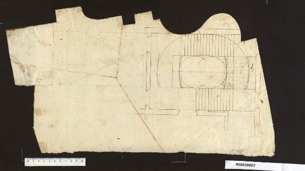 - NOTIZIE STORICO CRITICHE Il disegno è tracciato sul verso del modano realizzato per la costruzione del "portone di Lucca". Si tratta di uno scalone inserito in un vano rettangolare, presentato in due versioni sovrapposte: uno di forma rettangolare, l'altro di impianto ellittico (di cui sono tracciati i cerchi di costruzione) che ricorda alcune realizzazioni dell’ambito emiliano.\nNon esiste documentazione che attesti la possibile collocazione di questo elemento.