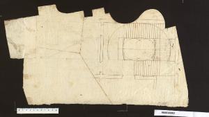 disegno eseguito con inchiostro bruno, a riga e compasso, su tracce della preliminare costruzione a grafite e altri schizzi a grafite a riga e compasso e a mano libera; è tracciato su foglio sagomato di carta imbrunita. Il supporto è composto da due fogli incollati