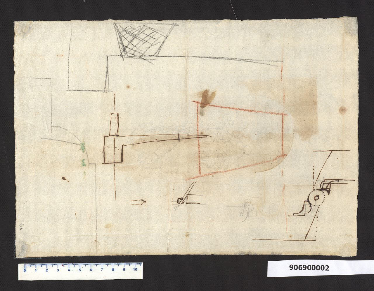 - NOTIZIE STORICO CRITICHE Si tratta dello studio per la cerniera in relazione al disegno di dettaglio del serramento tracciato sul recto del foglio. La cerniera è vista in prospetto e in pianta.