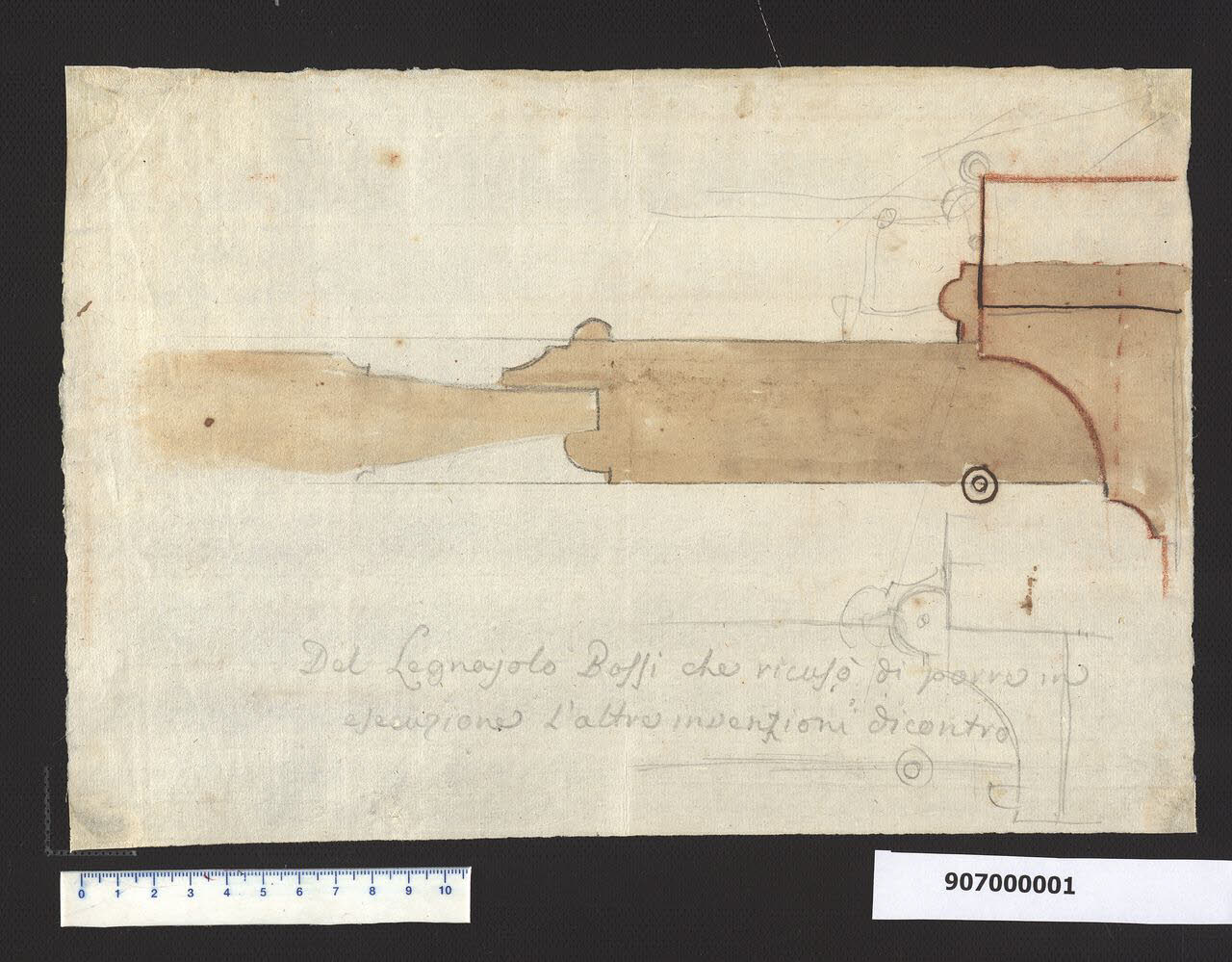 - NOTIZIE STORICO CRITICHE Si tratta di un disegno di dettaglio relativo a un serramento e in particolare del punto in cui l'anta è incernierata allo stipite. L'attribuzione al falegname Bossi, esecutore dei serramenti per conto di Giacomo Sardini, è formulata sulla base dell'iscrizione riportata da Sardini sul disegno e sulla differenza stilistica con altri due disegni inseriti nella collezione forse attribuibili a Sardini stesso.\nProbabilmente le idee progettuali del committente in relazione all'oggetto non erano attuabili e pertanto lo stesso Bossi avrebbe tracciato una soluzione più idonea.\nIl dubbio che permane è dovuto alla presenza sullo stesso foglio di altri schizzi a grafite, a cui potrebbe invece essere riferita l'iscrizione; tuttavia anche quelli potrebbero essere studi eseguiti dal Bossi.\nAnche la localizzazione non è documentata, tuttavia si ipotizza che il contesto sia il palazzo Sardini di Lucca, nel quale furono eseguiti lavori di ristrutturazione interna. \nIl disegno è da porre in relazione ad altri relativi allo stesso soggetto conservati nella Collezione (Milano, Collezione Sardini Martinelli, inv. 9,69r e v, 9,70v, 9,71r e v, 9,72 e 9,75 r e v).