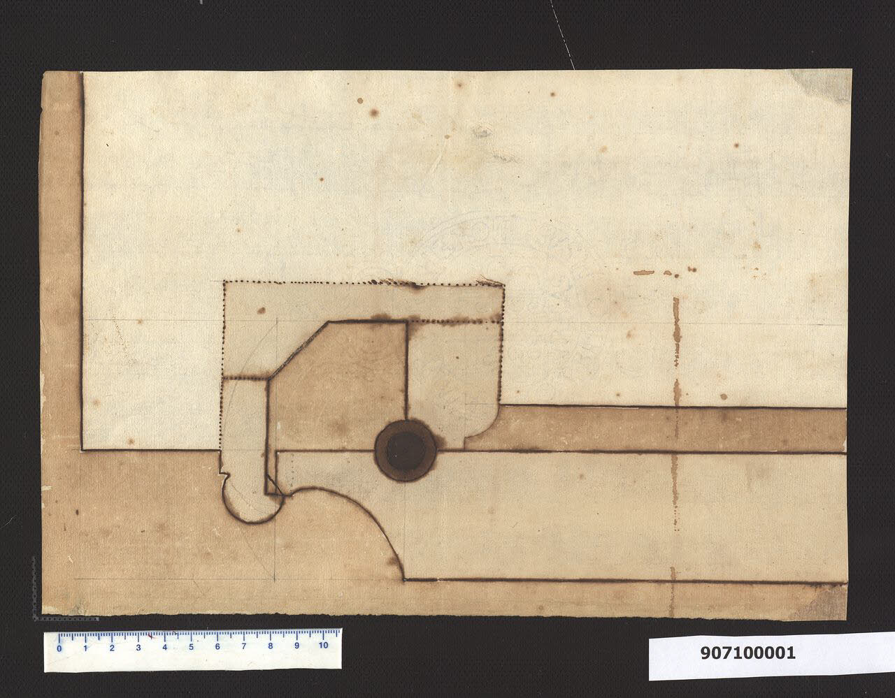 disegno eseguito con inchiostro bruno a mano libera su tracce della preliminare costruzione a grafite con tiralinee e compasso, acquerellato colore beige, marrone chiaro, marrone scuro e nero; è tracciato su carta chiara leggermente imbrunita