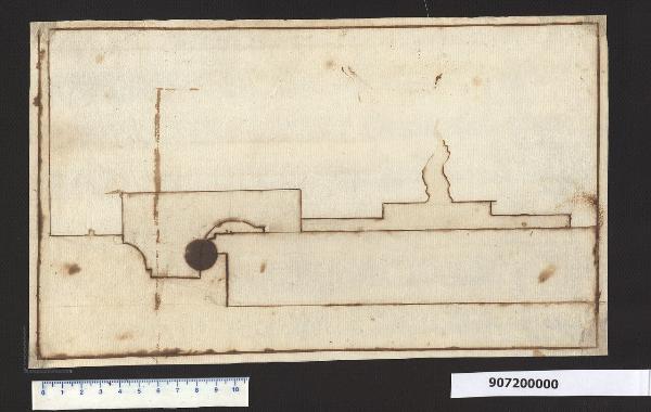 disegno eseguito con inchiostro bruno, principalmente a tiralinee e compasso e in parte a mano libera, acquerellatura a inchiostro bruno, schizzo a grafite sul verso; il disegno presenta una marginatura a inchiostro bruno a penna con sbavature ed è tracciato su carta leggermente imbrunita