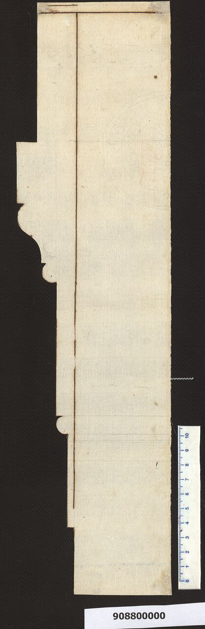 disegno sagomato che conserva tracce della preliminare costruzione a grafite; il profilo è tracciato a inchiostro bruno a penna su carta avorio