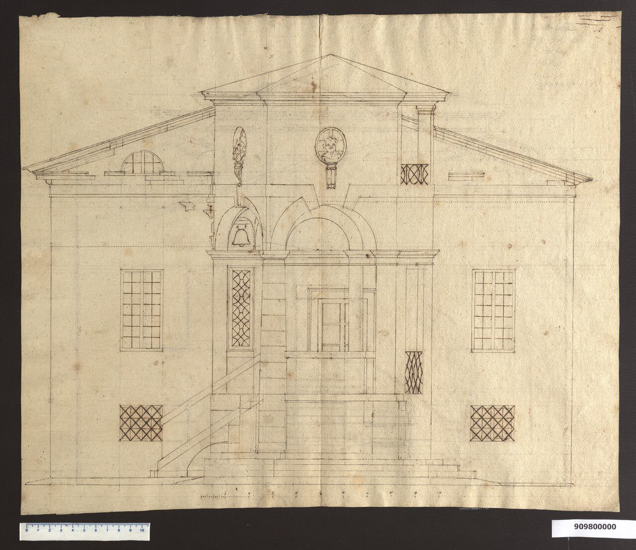 disegno in scala, conserva tracce della preliminare costruzione a grafite; è eseguito a inchiostro nero a penna principalmente con tiralinee e compasso e a mano libera nelle parti ornamentali; presenta numerose rasure e i rimandi numerici dell'iscrizione a matita sono stati cancellati; il supporto sul quale è tracciato è carta avorio