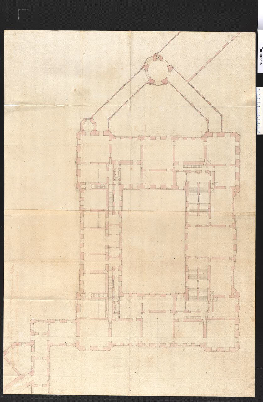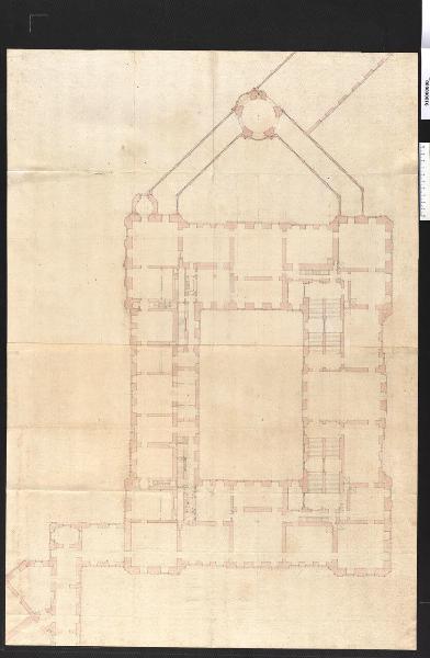 - NOTIZIE STORICO CRITICHE Il disegno si riferisce alla pianta del piano nobile del castello che Martinelli progetta per il principe Johann Wilhelm von der Pfalz a Düsserldorf, tra il 1698 e il 1699, edificio che non verrà mai realizzato.\nLa sequenza degli ambienti al piano nobile segue uno schema rigidamente simmetrico lungo l'asse trasversale, probabilmente per rispondere all'esigenza di creare due appartamenti distinti (per il principe e la moglie), dotati ognuno di una cappella. A questa ipotesi, si potrebbe collegare anche quanto afferma Martinelli stesso parlando di un settore dei mezzanini: "per il bisogno grande che richiede l'haver più vicine all possibile le femine che deveranno servire alla Serenissima" (Biblioteca Statale di Lucca, ms. 1856 ff. 237r-243v). Tuttavia mancano indicazioni sulle destinazioni d'uso del secondo piano.