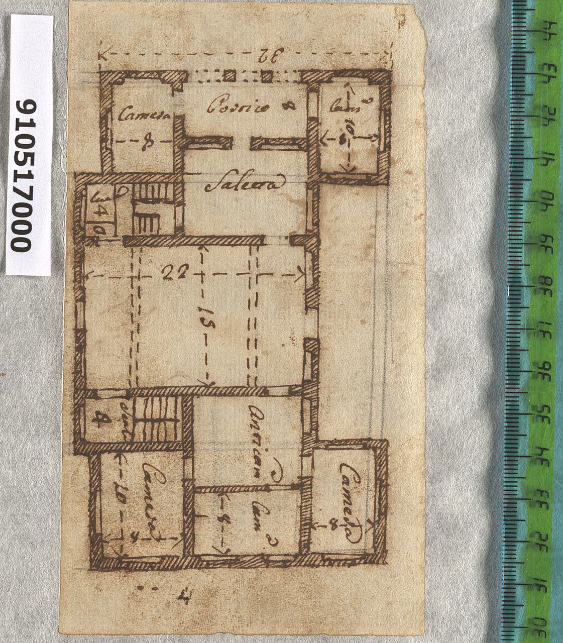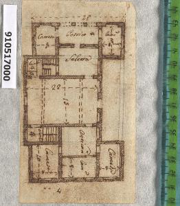 disegno quotato eseguito a mano libera con inchiostro bruno a penna su carta avorio; lo spessore dei muri è reso a tratteggio; il corretto orientamento del foglio prevede che l'angolo irregolare sia in alto a sinistra