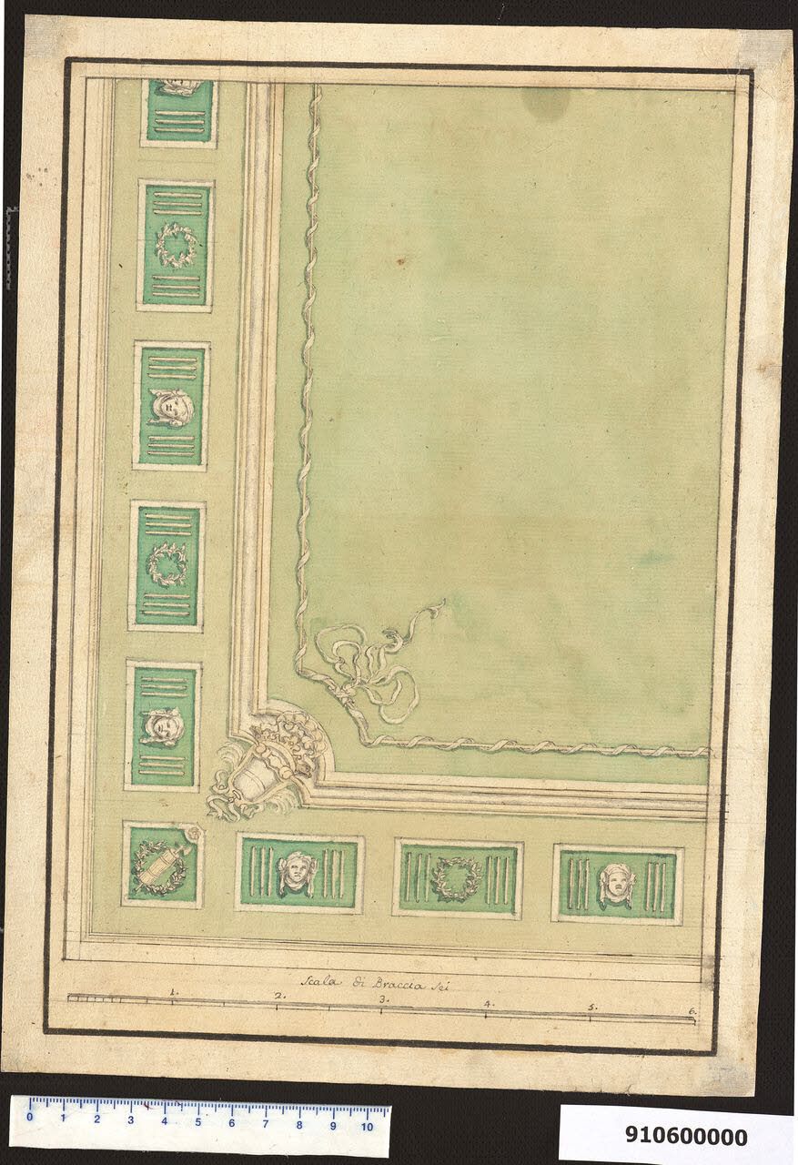 - NOTIZIE STORICO CRITICHE Il senatore Giovanni Battista Montecatini, per la cui casa il presente disegno è stato delineato come si evince dall'iscrizione sul verso, era spesso tra gli ospiti del marchese Giacomo Sardini nella villa a Pieve Santo Stefano. La decorazione della villa si era conclusa verso la fine degli anni ottanta con l'ornamentazione del soffitto nella quale confluivano elementi pittorici e monocromi con finti bassorilievi di stucco. Si trattava dell'importazione del gusto diffuso dal bolognese Carlo Bianconi, incline a coniugare l'evocazione delle vestigia della classicità con quella dei maestri del Cinquecento (Milano, Collezione Sardini Martinelli inv. 9,86). Le novità giunte in Lucchesia attraverso i contatti di Sardini con Bianconi avevano fatto presa sull'aristocrazia locale tanto che al marchese, dilettante d'architettura, fu richiesto da un altro degli amici, Tommaso Trenta, un progetto per la facciata della propria villa a Montramito (I. Belli Barsali, Ville e committenti dello Stato di Lucca, Lucca 1980, p. 506). I mascheroni nel presente disegno sintetizzano formule osservabili in altri due fogli di Sardini (Milano, Collezione Sardini Martinelli inv. 9,75v; 9,92). Non si hanno notizie a proposito dell'effettiva realizzazione del soffitto.