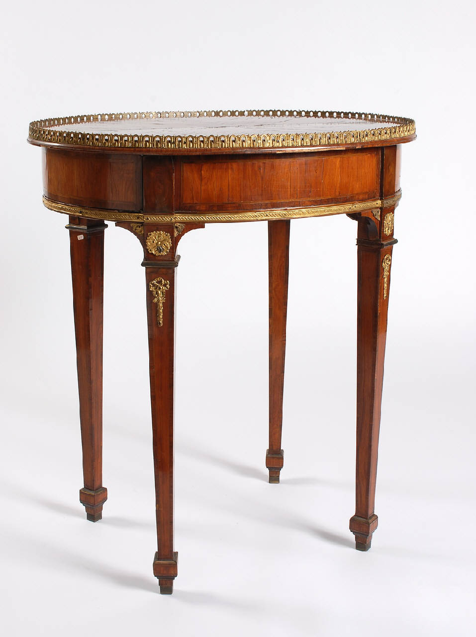 - NOTIZIE STORICO CRITICHE tavolino ovale in stile Luigi XVI di buona qualità, impiallacciato con legni pregiati e arricchito da applicazioni in bronzo dorato aggiunte forse nel corso del secolo successivo.