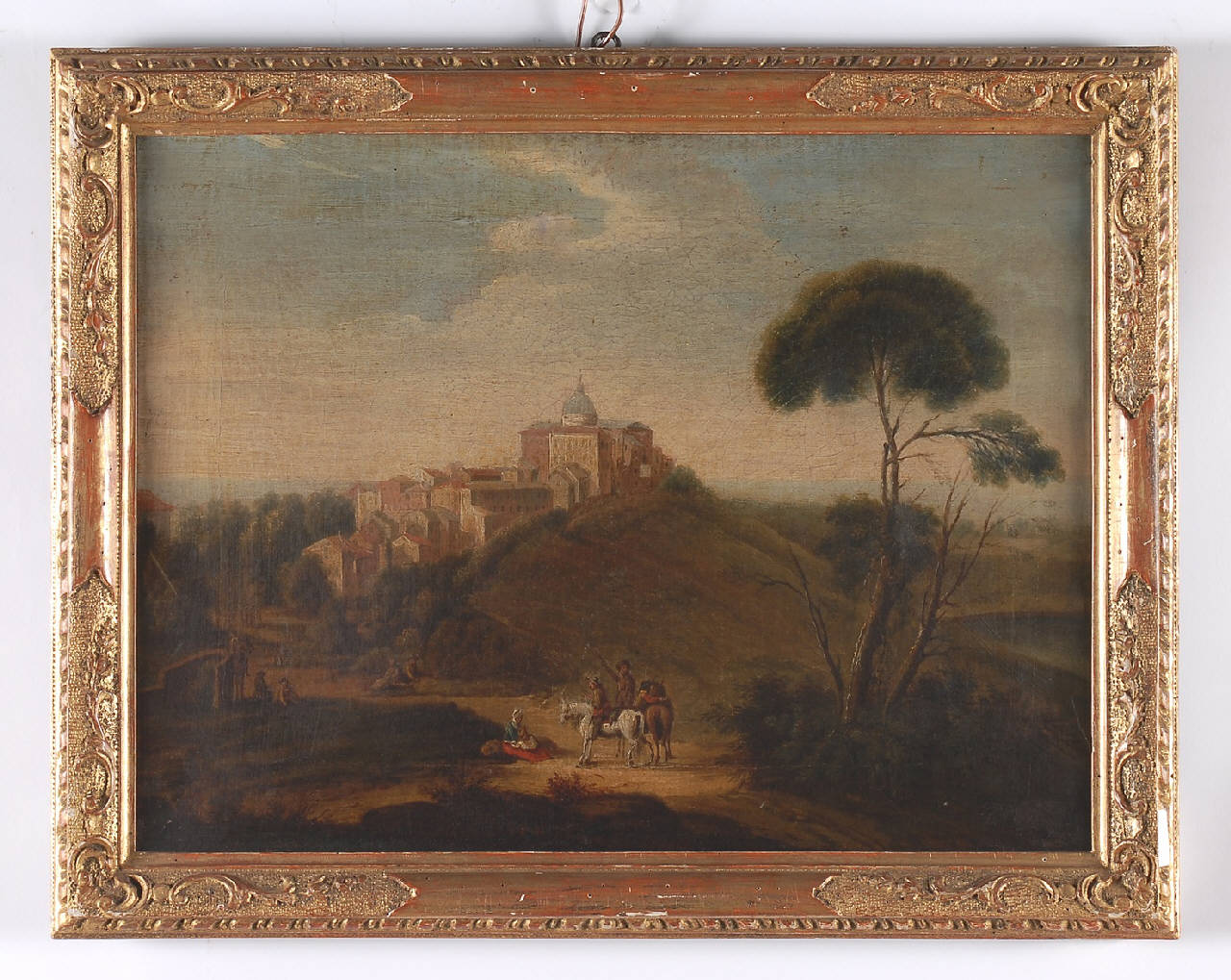 Dipinto inserito entro cornice lignea dorata arricchita in prossimità degli angoli da motivi vegetali stilizzati su fondo puntinato. Raffigura un paesaggio romano animato da figure, alcune a cavallo, di sapore popolare. Cittadella posta sopra un'altura rocciosa; contrasti di luce e ombra; le tonalità di colore sfumano sullo sfondo del paesaggio.