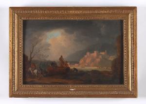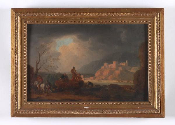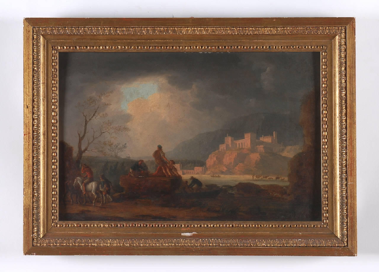 Dipinto inserito entro cornice lignea dorata arricchita da motivi decorativi geometrici e modulari. Raffigura un paesaggio animato da episodi di vita quotidiana con figure di villani. In primo piano alcune figure popolari sono impegnate in azioni relative all'attività della pesca; sullo sfondo, montagne con edifici fortificati. Il paesaggio è illuminato da uno squarcio luminoso nel cielo oscuro.