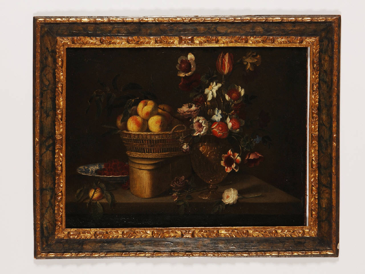 Dipinto inserito entro cornice in legno marmorizzato, arricchita da intagli dorati con motivi decorativi vegetali stilizzati. Raffigura una natura morta con frutta e fiori. Dal fondo scuro, emergono in primo piano, fiori di diverso tipo all'interno di un vaso ad anfora in metallo dorato riccamente lavorato a sbalzo, un cestino e un piatto con decori in blu, ricchi di diversi tipi di frutti, il tutto posato su una base di appoggio in legno. La luce proveniente da sinistra, mette in evidenza il realismo della composizione attraverso contrasti di luci e ombre.
