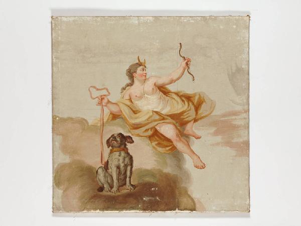 Dipinto in mediocre stato di conservazione raffigurante Diana in cielo poggiante su una nube. Lo sguardo è rivolto a destra intento ad osservare l'arco tenuto con la mano sinistra; con la destra tiene un cane al guinzaglio. I colori risultano accesi: si notano effetti cangianti per quanto riguarda le vesti.