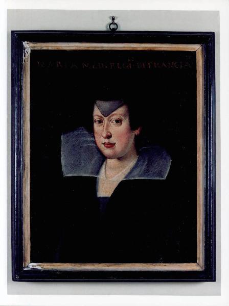 Dipinto inserito in semplice cornice di legno verniciato raffigurante il ritratto di Caterina Medici. Dal fondo scuro e compatto, privo così di ogni elemento che potrebbe distogliere l'attenzione dell'osservatore dal personaggio raffigurato, emerge il ritratto femminile, con abito scuro e ampio collo trasparente della veste sottostante. La posa è di tre quarti; risalta la ricerca di realismo per quanto riguarda la fisionomia del volto. La luce proviene da sinistra dando origine a contrasti di luci e ombre.