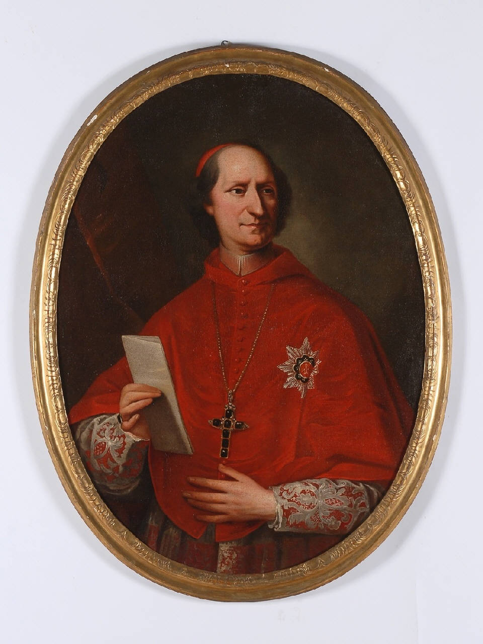 Dipinto di forma ovale inserito all'interno di una cornice in legno dorato, arricchita da motivi decorativi geometrici e modulari incisi. Raffigura in primo piano il ritratto di un cardinale. Dal fondo scuro, in cui si scorge a fatica un tendaggio posto all'estrema sinistra, e privo di ogni altro elemento che potrebbe distogliere l'attenzione dell'osservatore dal soggetto rappresentato, emerge al centro la figura maschile, leggermente di tre quarti che occupa gran parte della superficie pittorica messa a disposizione. La luce proveniente da destra, sottolinea la preziosità, l'eleganza delle vesti e la verità dei vari particolari decorativi, quali per esempio la finezza dei brani a ricamo. Passaggi graduali di chiaroscuro sottolineano la morbidezza degli incarnati; predominano tonalità calde di colore: su tutto spicca il rosso acceso del mantello.