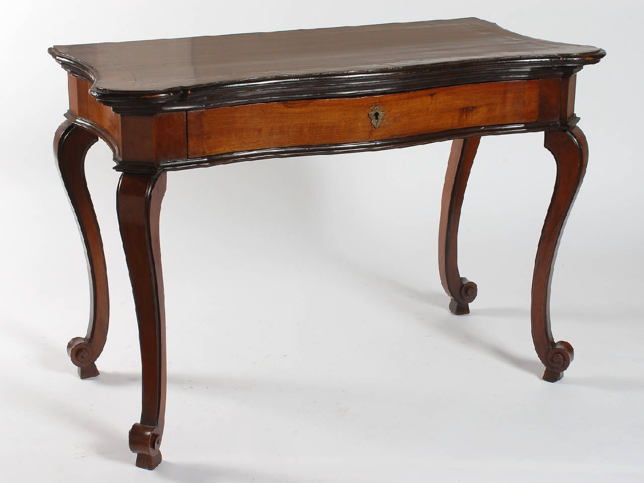 console in noce con bordi ebanizzati, piano sagomato con bordo modanato, cassetto sulla fascia e gambe mosse.