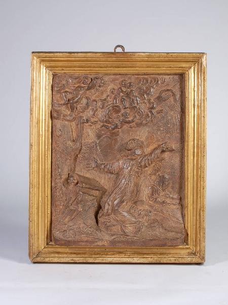 Pannello in terracotta a rilievo, inserito all'interno di una cornice in legno modanato e dorato. Raffigura in basso al centro San Francesco d'Assisi con le braccia aperte che riceve le stigmati; davanti a lui, un libro aperto posto su un basamento e il crocifisso posato sulle fronde dell'albero all'estrema sinistra. In alto, in mezzo alle nubi, un turbine di angeli in diverse posizioni e atteggiamenti. Alcuni elementi in secondo piano, sono evidenziati con un rilievo molto basso, quasi disegnati, e in alcuni punti la terracotta risulta incisa, suggerendo così la presenza di diversi piani e di conseguenza la profondità.