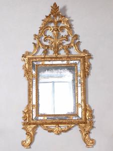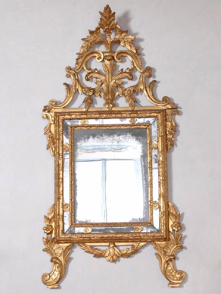Specchiera in doppia cornice dorata con ricca cimasa costituita motivi fogliacei. Si compone di un battente rettangolare intagliato; in basso i motivi fogliacei si foggiano a mo' di cespi fogliacei per andare a formare i due appoggi ai quali si appendono festoni, mentre piccoli tralci salgono sui fianchi.