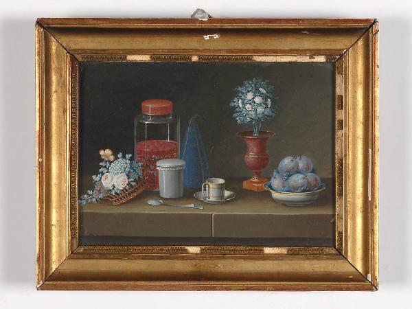 Dipinto inserito all'interno di una cornice in legno dorato, decorata con motivo decorativo modulare a palmette stilizzate, raffigurante una natura morta con fiori e oggetti. Dal fondo scuro emergono in primo piano, un vaso a coppa e un cestino traforato colmi di candidi e svariati fiori, altri oggetti di diversa natura e frutti, il tutto posto su un piano d'appoggio dato da un semplice parapetto. La luce, diffondendosi in primo piano, crea contrasti chiaroscurali, sottolineando la naturalezza del soggetto rappresentato, la verità nella resa dei materiali, ad esempio la trasparenza del vetro e la freddezza del metallo.