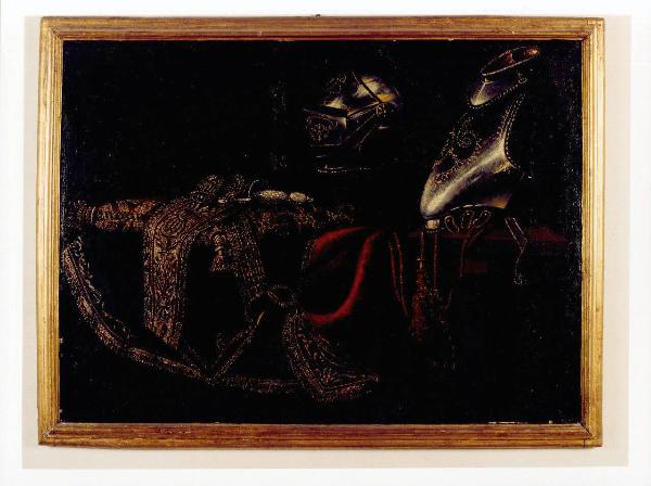 Dipinto inserito entro una semplice cornice in legno dorato e modanato, raffigurante in primo piano una natura morta. Dal fondo scuro, emerge la composizione di oggetti, data da panneggi, armatura e occhialini, posati su un tavolo. La luce proveniente da sinistra, crea effetti chiaroscurali, mettendo in evidenza la preziosità dei tessuti e il tono metallico e freddo dell'armatura.