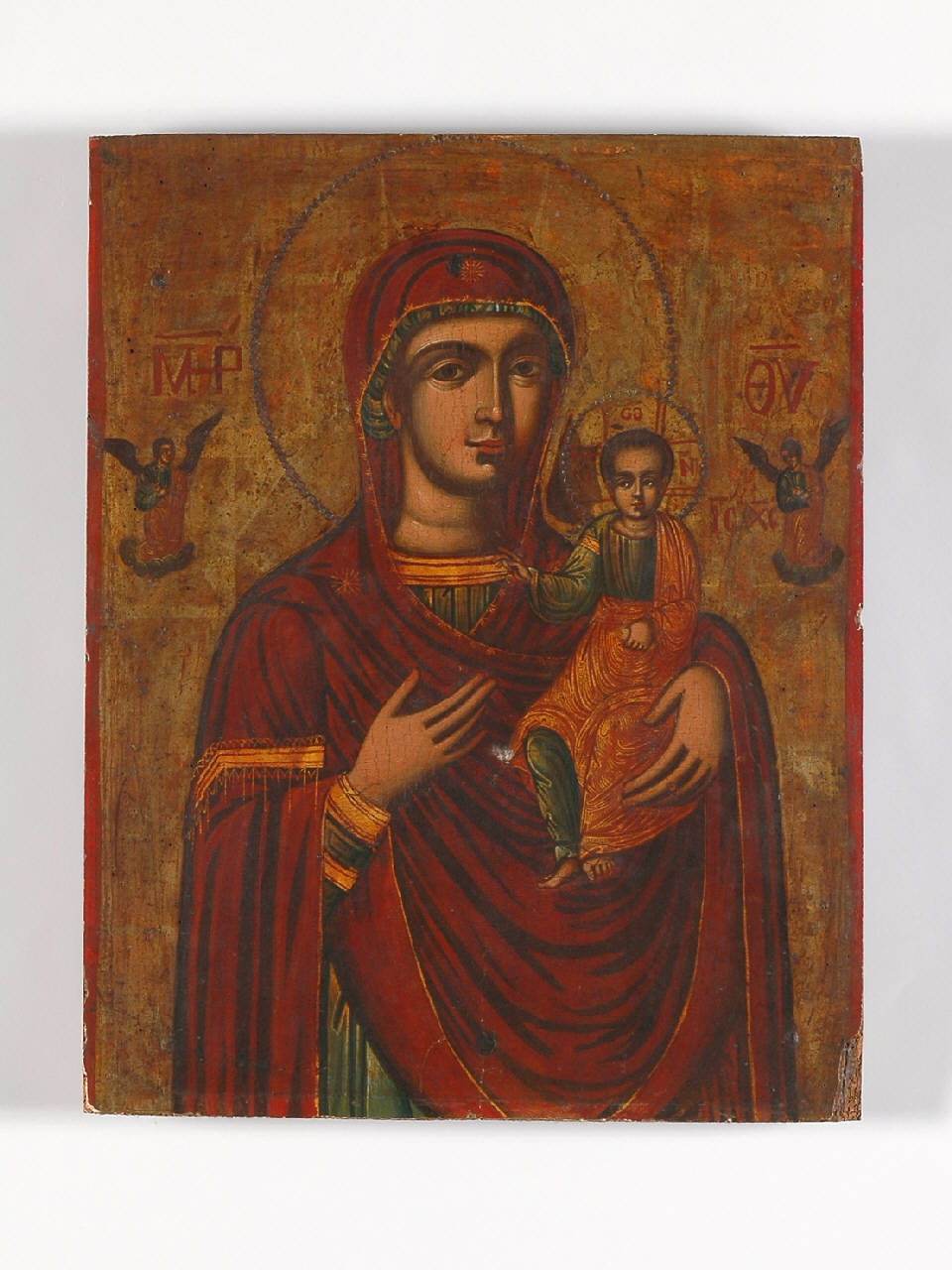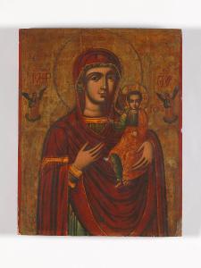Icona raffigurante Madonna con Bambino; ai lati, figure di angeli, uno per lato, posti su nubi. Le vesti hanno un sapore orientaleggiante; lo sfondo è dorato.