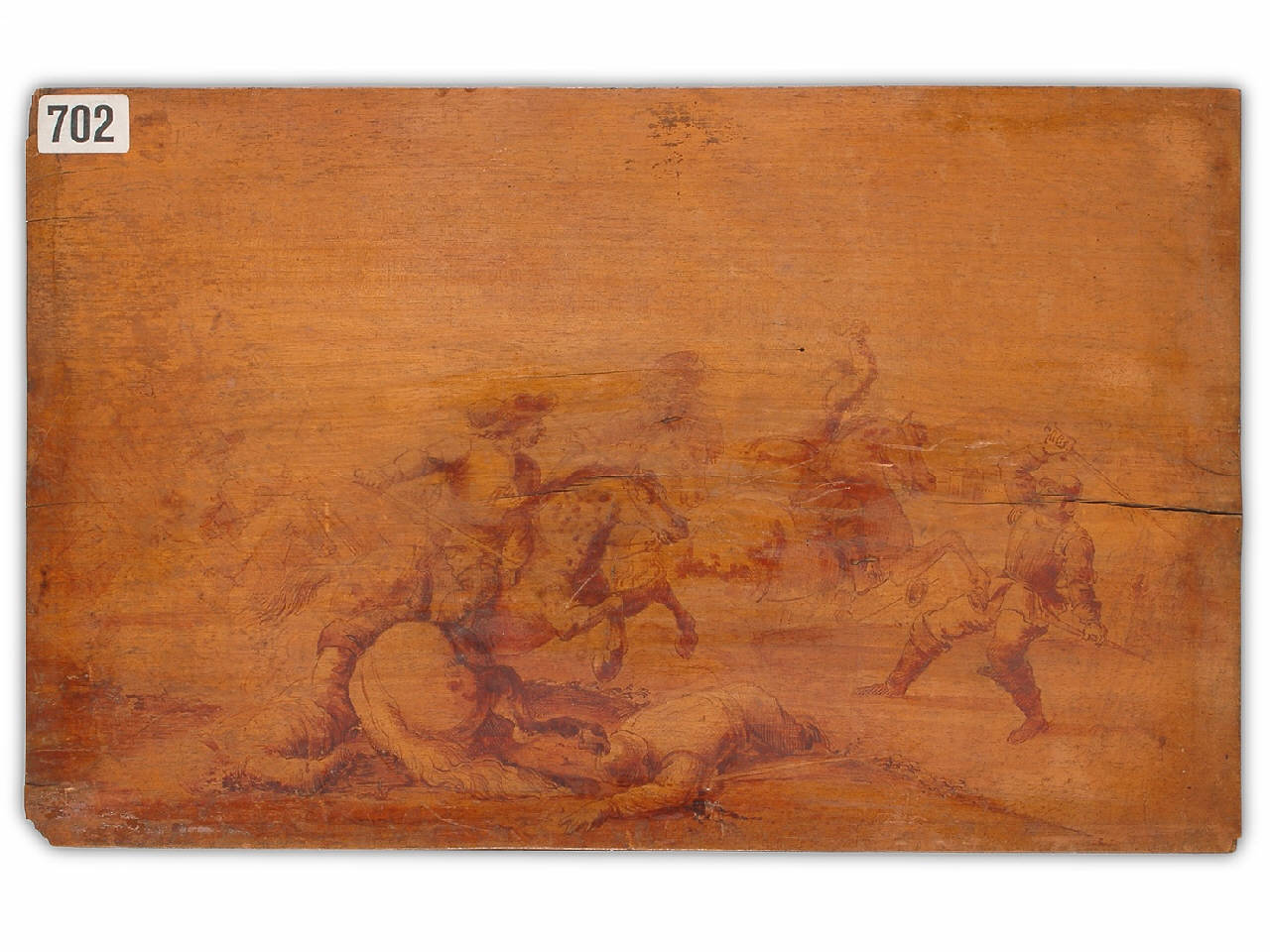 Dipinto privo di cornice raffigurante una scena di battaglia. Predominano tonalità di colore molto calde; si noti la ricerca anatomica dei cavalli, ad esempio nella resa della muscolatura, e il dinamismo generale della composizione.