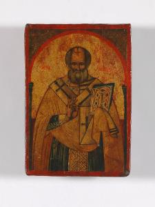 Icona raffigurante un Vescovo bizantino. Il fondo è dorato; sia all'estrema destra e all'estrema sinistra si intravedono due colonne con relativo capitello che idealmente sorreggono un arco: il tutto crea una sorta di quinta scenografica. Tonalità molto calde per quanto riguarda la cromia generale del dipinto.